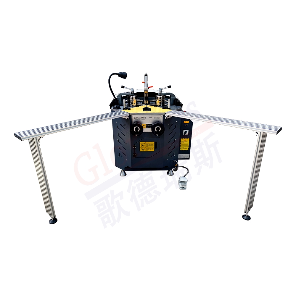 該組角機是高檔鋁門窗生產專用設備,適用于角碼結構型鋁門窗90度角聯接。安裝三套型材加工刀具,減少換刀時間,增加工作效率,常用刀具可長期固定使用。